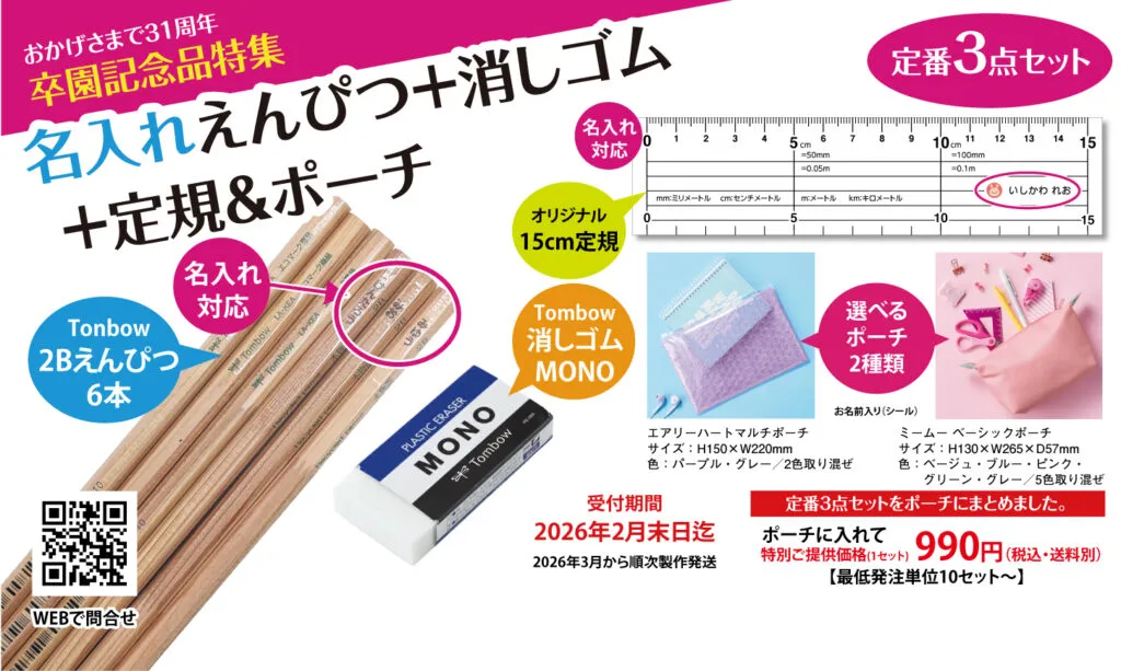 ① 名入れえんぴつ+消しゴム+定規+ポーチ(名入れシール付) 990円(税込)
