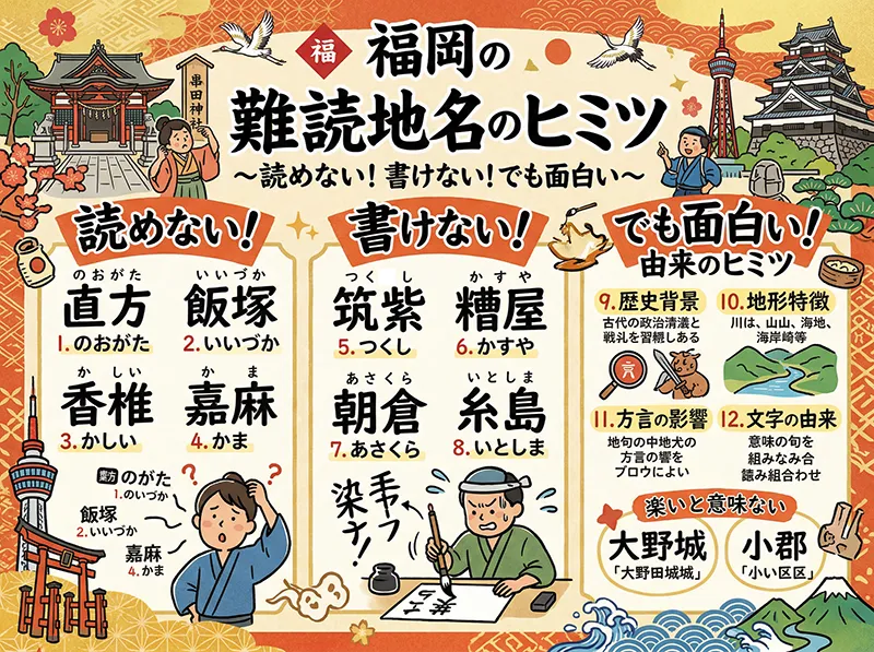 今回は、そんな福岡の難読地名の面白さや由来を、楽しくわかりやすく紹介していきます。